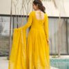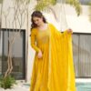 Elegant faux blooming gown with intricate embroidery, zari, and sequins work. Features a 3.5 MTR flair, full cotton lining, full sleeves, and round neck. Comes with a matching dupatta with sequins work and a designer lace border. Available in 2 colors. Price: ₹4,150.00.